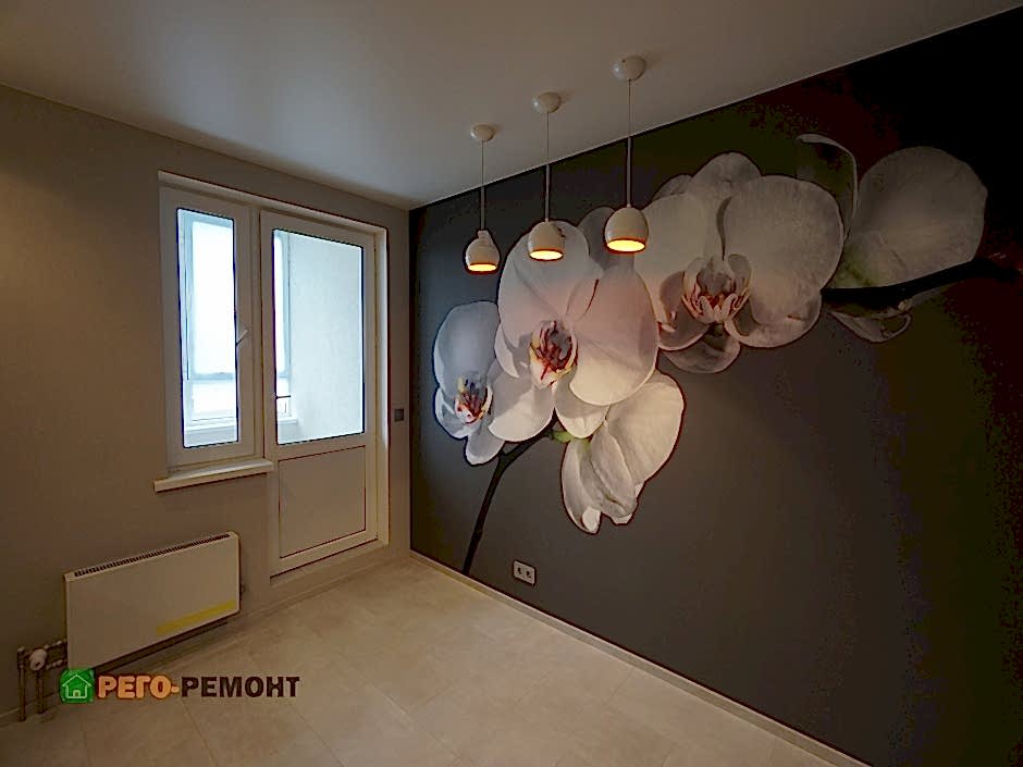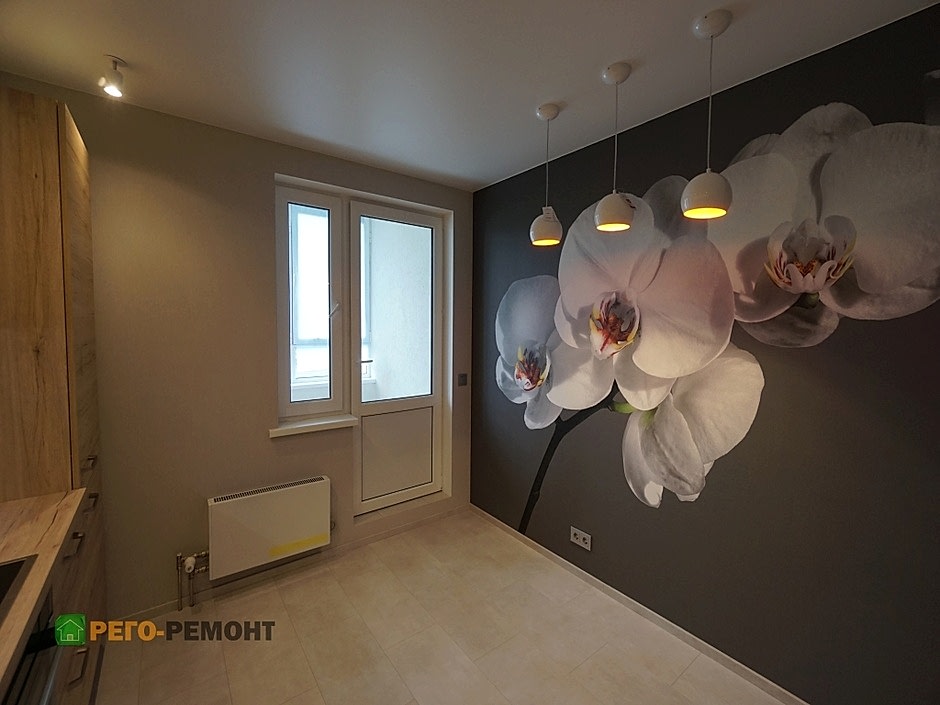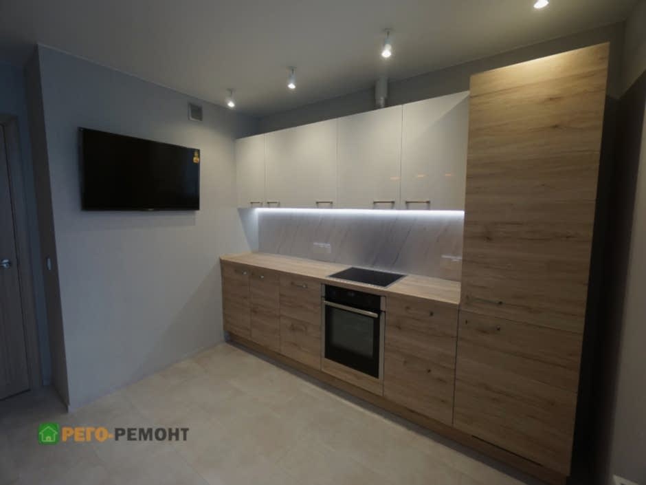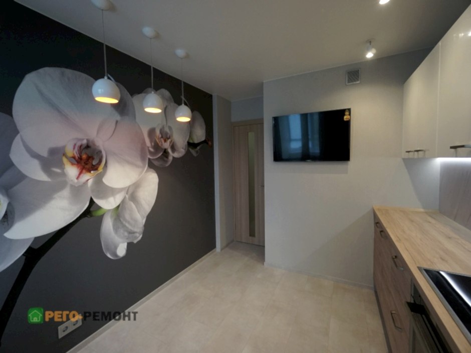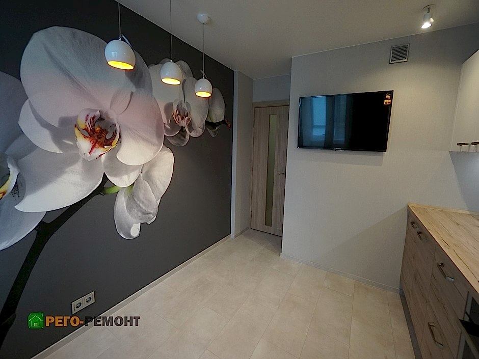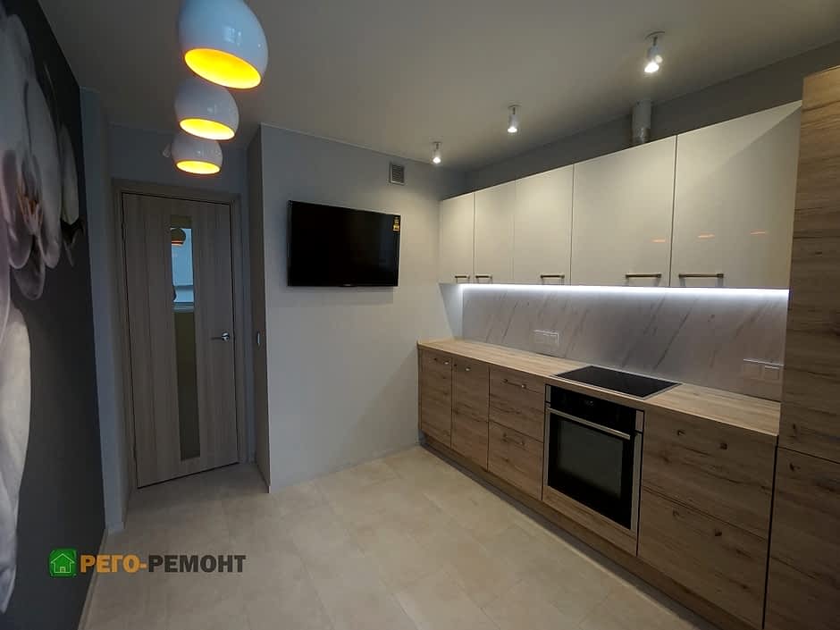 Ремонт кухни под ключ на улице Рабочая. Закончены демонтажные и Пин-ап работы. Ремонт кухни подходит к финишной прямой. Кухня выполнена по индивидуальному заказу, частично установлена бытовая техника. Напротив кухни во всю стену - фотообои.