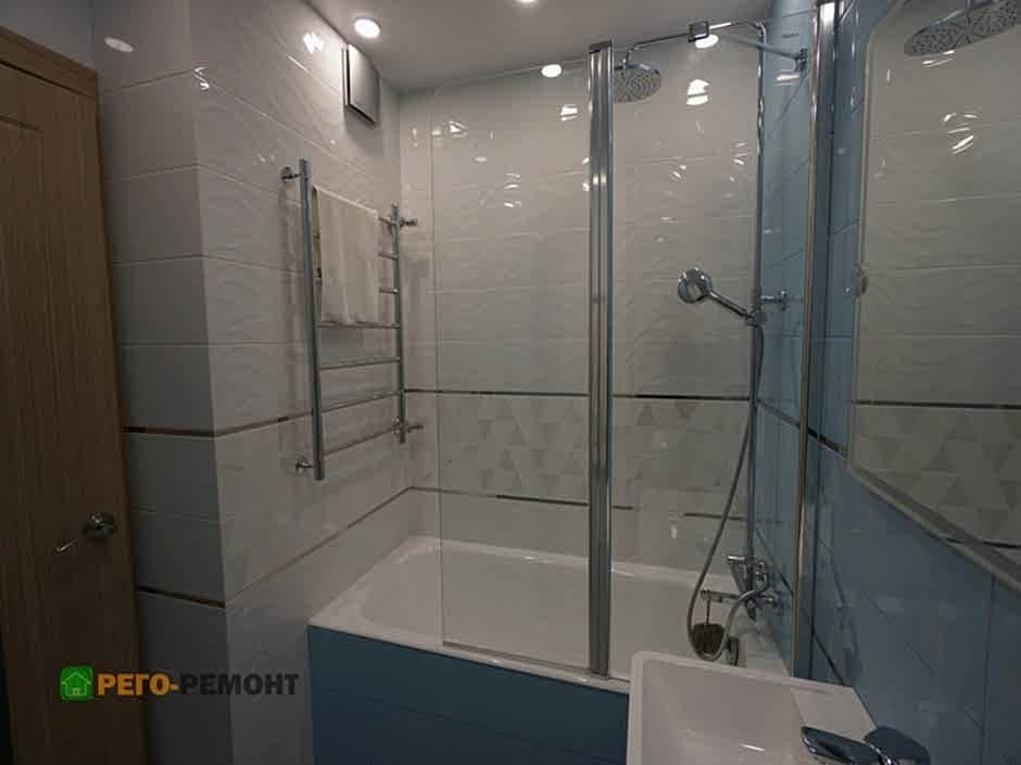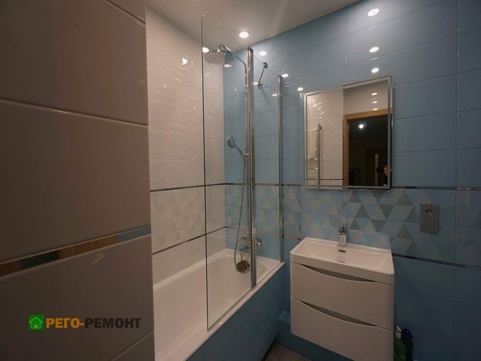 Ремонт ванной комнаты под ключ на улице Рабочая. Закончены демонтажные и монтажные работы. Ремонт ванной подходит к Пин-ап прямой. Ванная комната выполнена в бело-голубой плитке. По всему периметру ванной - орнаментальная вставка из плитки другого вида.